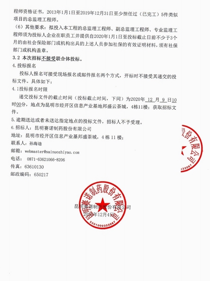 昆明賽諾制藥股份有限公司《中藥原料藥提取基地和綜合生產車間建設項目》建設工程監理招標公告